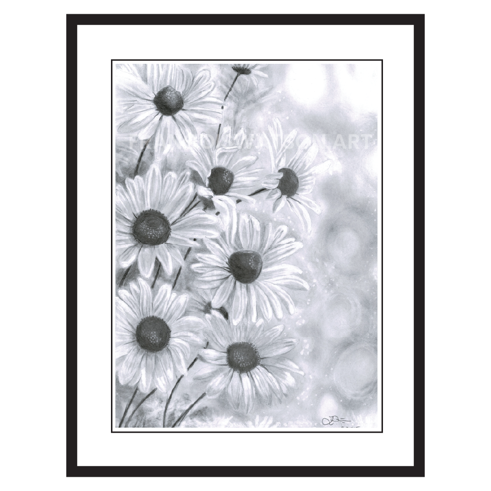 Daisies is a delicate graphite drawing that captures the gentle elegance of white daisies in full bloom. The soft shading and subtle transitions showcase the incredible range of pencil work, bringing out the lightness of each petal with a near ethereal quality. Set against a moody, blurred bokeh-style background, the flowers seem to float, their simplicity made all the more striking by the contrast. Rendered on Arches 300gsm paper, this piece highlights the quiet beauty that can be achieved with graphite, proving that even in black and white, nature’s softness and grace can shine through.